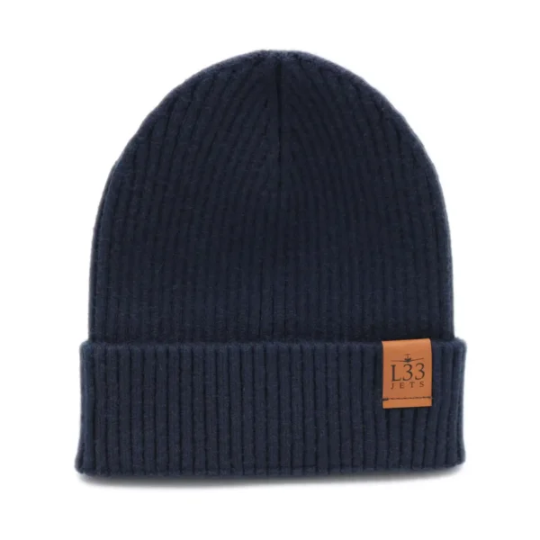 Crafted knit men’s beanie with folded cuff, featuring a Latitude 33 Aviation logomark icon debossed leather detail.