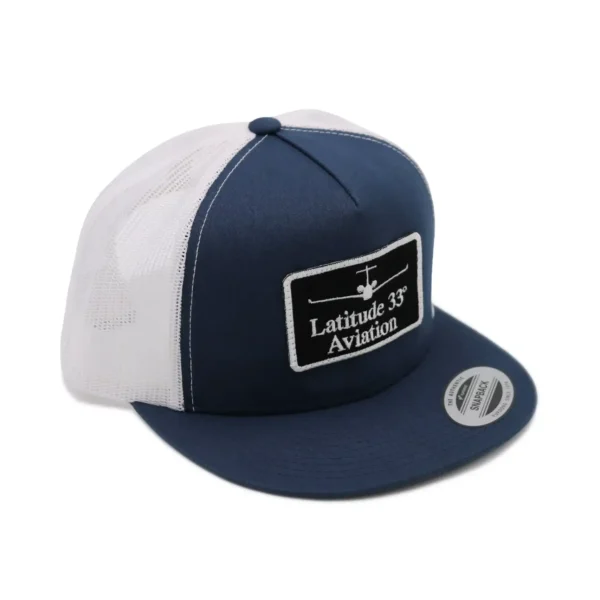 Patch Trucker Hat with the Latitude 33 Aviation logo embroidery into a patch.